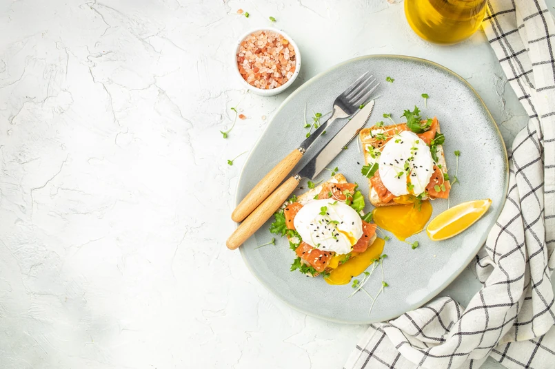 - Na podgrzanej wcześniej kromce chleba lub bułce ułóż plasterki łososia i jajko w koszulce. Całość posyp koperkiem lub szczypiorkiem.