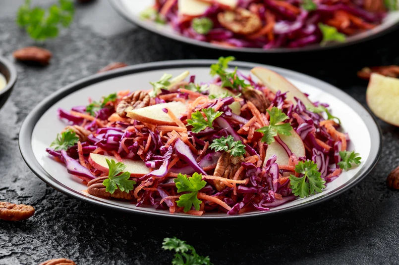 Czerwoną kapustę warto jeść na surowo. Jest pyszna i chrupiąca. Czerwona kapusta dostarcza mnóstwo błonnika, witamin - C, K, A, z grupy B - oraz antyoksydantów (antocyjany), które działają przeciwzapalnie i wspomagają trawienie.