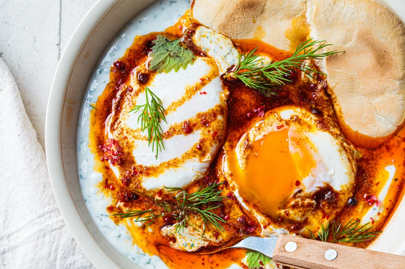 Niektóre jajeczne dania robią międzynarodową karierę. Tak jest z jajkami po turecku. Na osmańskich stołach gościły już w XV wieku. Są wciąż niezwykle popularne w Turcji i na Bałkanach, a teraz dzięki potędze internetu stały się modne w wielu innych krajach. Nic dziwnego, bo to pyszne i szybkie do przygotowania danie składające się z gęstego jogurtu doprawionego czosnkiem i cytryną, jajka w koszulce z rozpływającym się po talerzu żółtkiem oraz palonego masła ze szczyptą chili. W oryginale używa się do niego także papryki z Aleppo, która jest ostra, dymna i ma delikatnie owocowy aromat. Można ją jednak zastąpić wędzoną papryką albo chili. Dzięki temu jajka po turecku są dość pikantne. Będą łagodniejsze, gdy zastąpimy je słodką papryką.