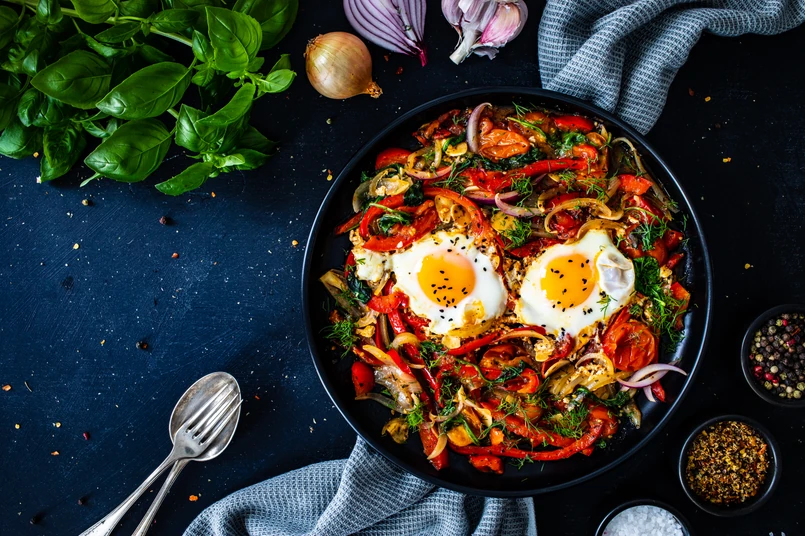 Do szakszuki najlepiej użyć dużych jajek "zerówek” maksymalnie świeżych. W szakszuce połączone są one z pomidorami, co ma kolejne zalety. Te warzywa są bogata w likopen, który działa przeciwzapalne i antybakteryjne. Szakszukę więc warto przygotować sobie w zimny poranek. Często jest ona porównywana do jajecznicy. Jednak w tej potrawie jajka są duszone, a nie smażone. To sprawi, że będzie bardziej lekkostrawna.