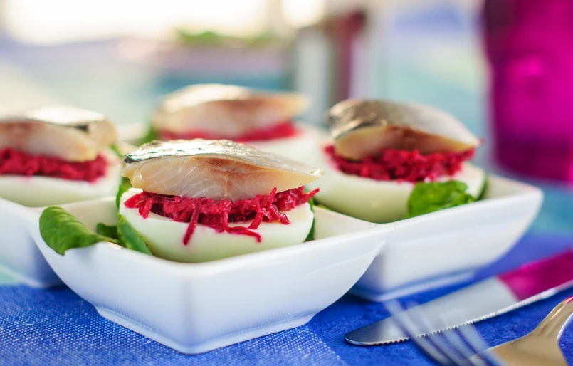 Tak przygotowaną pastę włożyć do rękawa cukierniczego i nałożyć do przekrojonych białek po jajkach. Jeśli nie mamy rękawa, można to zrobić łyżką. Śledzia pokroić w cienkie plasterki i położyć na jajkach. Czerwoną cebulę posiekać w cienkie piórka i posypać nią półmisek. Udekorować szczypiorkiem oraz rzeżuchą.