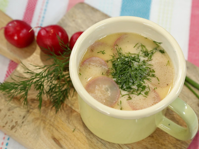 Zupa wiosenna z rzodkiewką z przepisu Ewy Wachowicz sprawdzi się idealnie. Zwłaszcza, że gotowana jest na bulionie drobiowym i z dodatkiem ziemniaków.