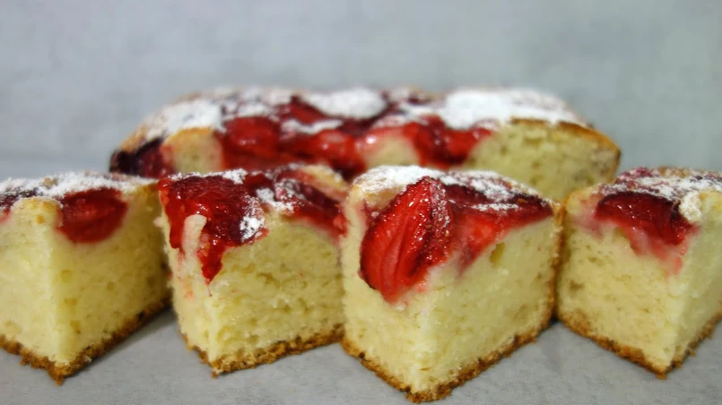 Truskawki oprószamy dużą łyżką kisielu. Do jajek dodajemy cukier i szczyptę soli oraz ubijamy na puszystą masę. Do masy jajecznej dolewamy mleko, dodajemy proszek i majonez, po czym dokładnie mieszamy. Ciasto łączymy z mąką do uzyskania jednolitej konsystencji. Ciasto wykładamy do formy wyłożoną papierem do pieczenia. Powierzchnię wyrównujemy, po czym wykładamy na nią truskawki.