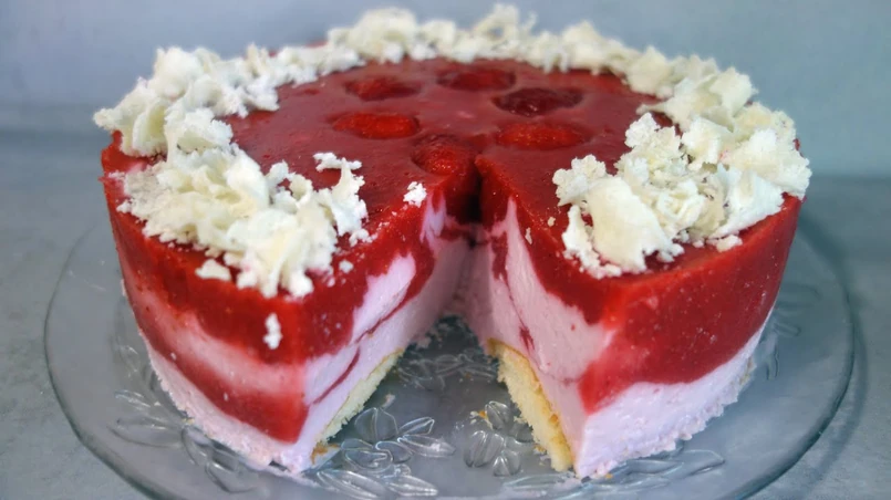 Dwie galaretki rozpuszczamy w połowie szklanki wrzącej wody i mieszamy do całkowitego rozpuszczenia. Truskawki zasypujemy połową szklanki cukru, przegotowujemy, dodajemy suchą galaretkę i miksujemy. Studzimy zarówno wcześniej przygotowaną galaretkę, jak i mus truskawkowy.