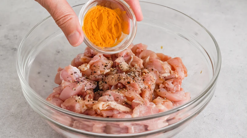 Marynowanie: Miskę przykryj folią spożywczą i wstaw do lodówki na 30 minut. Dzięki temu kurczak przejdzie smakiem przypraw i ziół oraz stanie się soczysty i miękki.