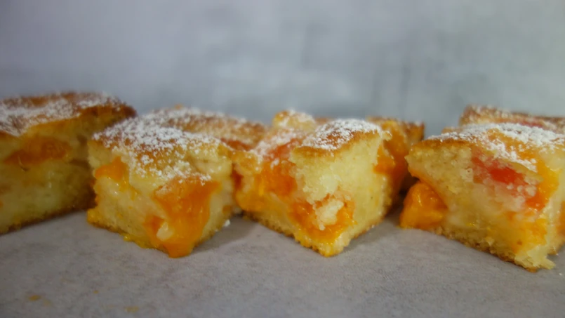 Morele opłukać, pokroić na połówki, wyjąć pestki, po czym lekko posypać bułką tartą. Ułożyć na cieście.