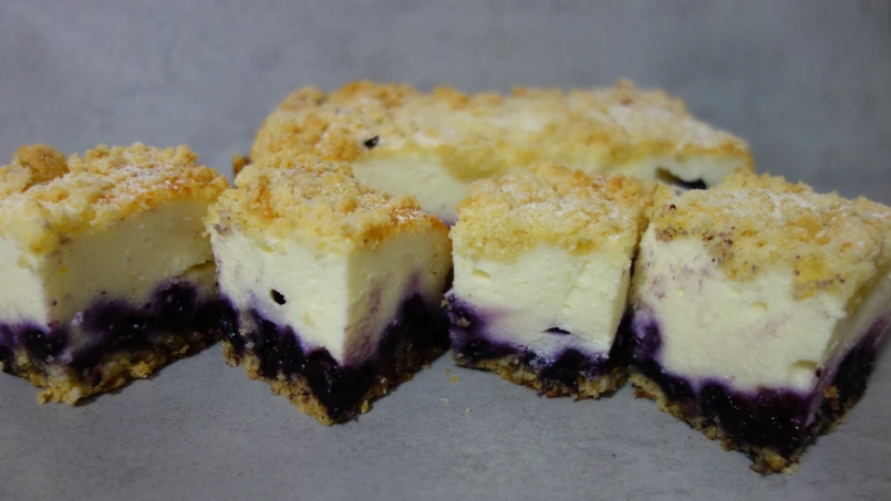 Na ciasto wykładamy jagody, masę serową, a na nią pozostałe ciasto.