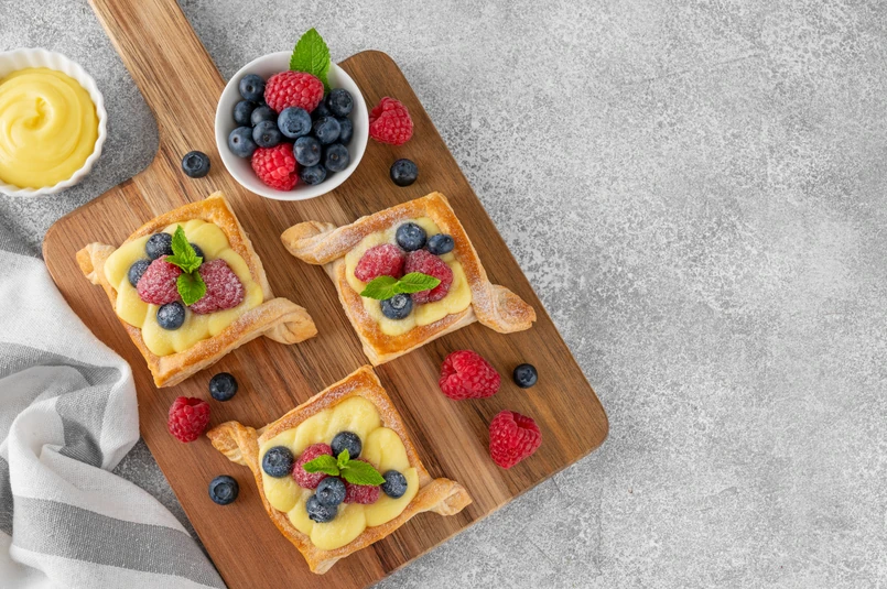 Te ciasteczka z przepisu Ewy Wachowicz są nie tylko bardzo smaczne, ale też nie takie trudne do zrobienia. Francuskie, kruche ciasto jest tu połączone są z masą budyniową i borówkami. Dopełnieniem jest bita śmietana i dekoracja w formie listków mięty.