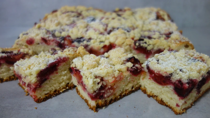 Ciasto wykładamy do formy 25x37 cm wyłożonej papierem do pieczenia. Na ciasto dajemy owoce, a na nie kruszonkę.
