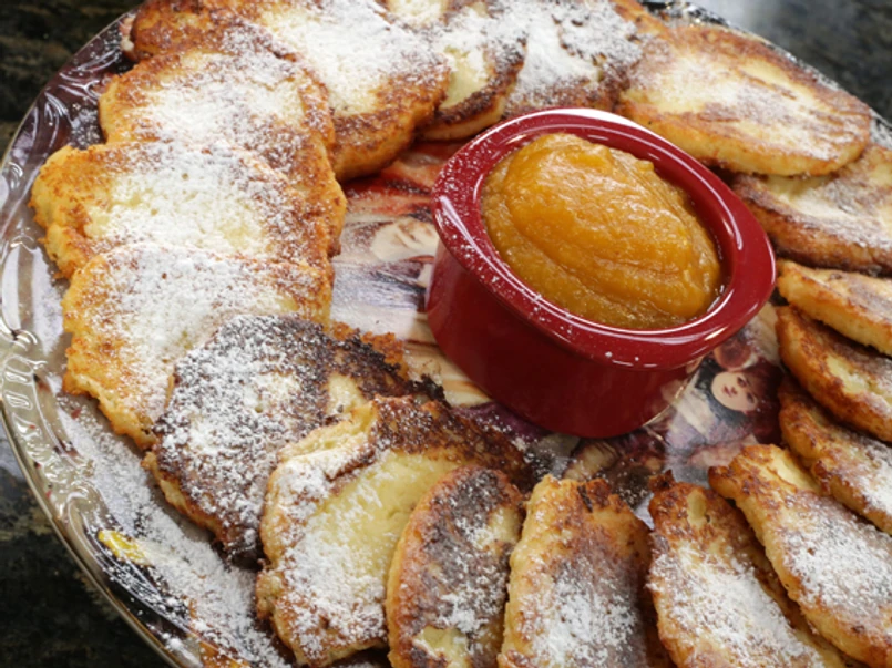Uformować jak racuchy i usmażyć na maśle. Odsączyć z nadmiaru tłuszczu. Oprószyć cukrem pudrem.