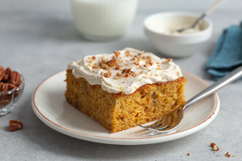 Wstawić do piekarnika i piec przez ok. 20 - 25 minut. Wyjąć z piekarnika i ostudzić. Polewa (opcjonalnie): serek miksować przez ok. 1 - 2 minuty z dodatkiem miodu i soku z cytryny. Wyłożyć na ciasto, udekorować odłożoną startą marchewką.