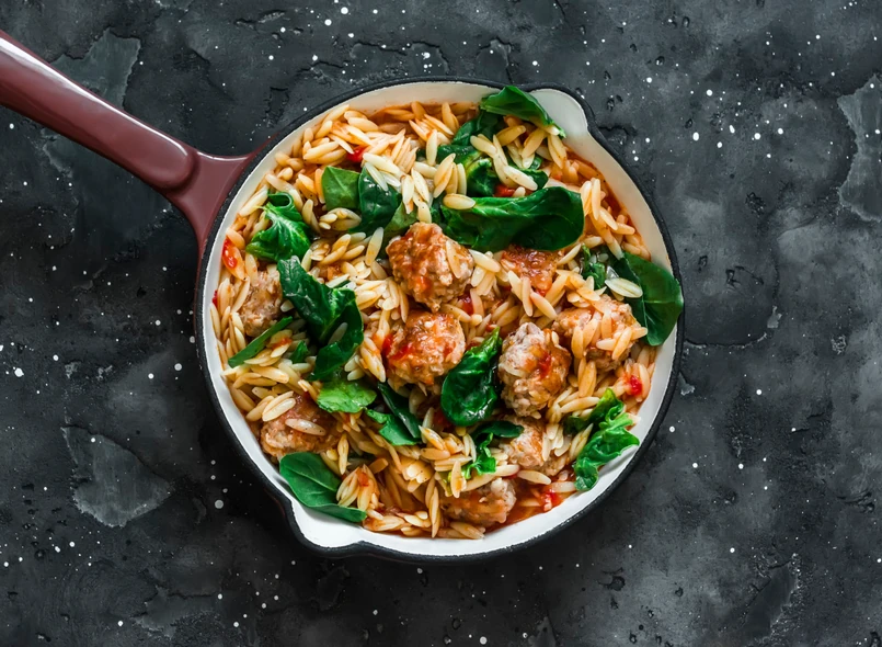 Makaron orzo z kurczakiem i szpinakiem. Lekkie danie na lato